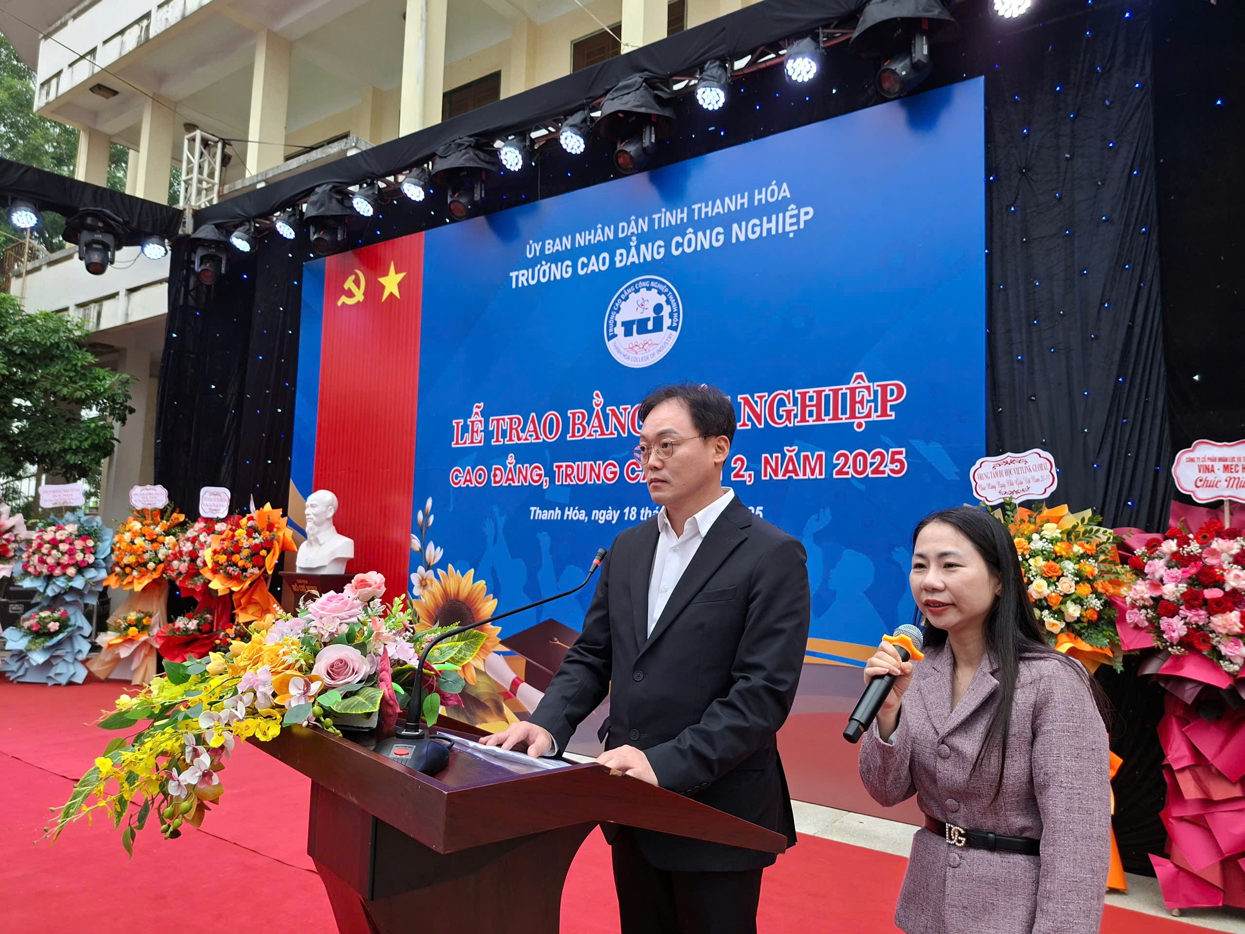 Ông Kim Kwang Yoon – Giám đốc Công ty Otrontech Vina phát biểu tại Lễ trao bằng tốt nghiệp cho HSSV